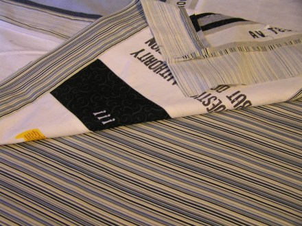 Line up your shirts in the order you wish them to be on the quilt. This usually takes place on the floor, as I don’t have a table big enough for the full visual. Now begin assembling your quilt, starting with top cross-piece, then a shirt square, then another cross piece, then a square, and so on,